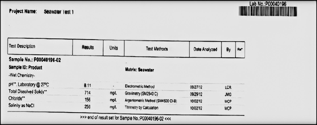 The Energized “MeV” seawater laboratory testing as shown above was carried out with one small Cold Fission Reactor System, no chemicals were used or required. No toxic salt brine is discharged once the destructible Sodium (Na) with 11 destructible electrons and Chlorine (Cl) with 17 destructible electrons are broken down and destroyed. No destructive salt brine is produced so there is no Sodium Chloride (NaCl) to discharge back into our precious oceans. This green technology changes the world of desalination forever, low cost, no discharge, just clean potable water. Combine this with our Green Energized “MeV” Production Generators which will produce very low-cost electricity.
