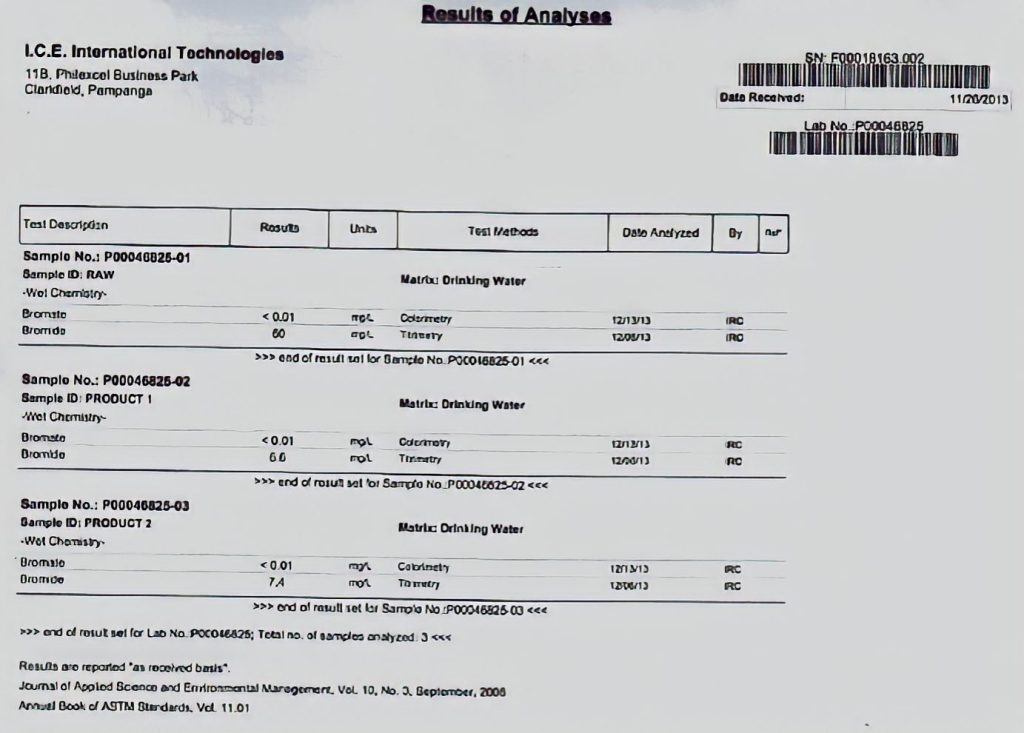 (This test was artificially spiked with ozone) If ozone O3 is used, Bromide (Br) with 35 destructible electrons can be converted into toxic cancer causing Bromate which is a destructible chemical. Please note, in the raw water the Bromide (Br) is 60 in laboratory test No1. After passing through the Energized “MeV” Reactor the Bromine (Br) was broken down and reduced to 6.6 and no bromate formed because its molecular structure will always be destroyed. In the second laboratory test the bromide reduced from 60 to 7.4, and once again no bromate formed. Energized “MeV” Reactors can have many settings and adjustments which can be applied. We are looking to license/sell this world changing technology breakthroughs, or possible joint Ventures. For Licensees the money is in the water charging for every cubic meter treated, not in selling equipment. Phone Ian on +61 406 143 187. One phone call may change the world forever!!! Copyright ©2023.